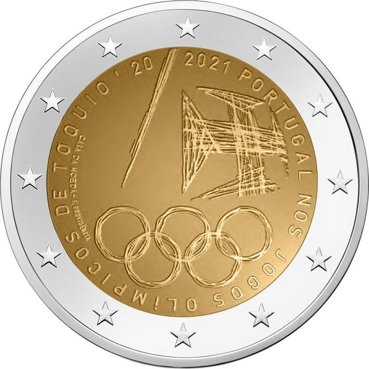 Opis: Moneta przedstawia stylizowane logo Portugalskiego Komitetu Olimpijskiego. Otacza je napis „Portugal nos Jogos Olímpicos de Tóquio’20 2021”.