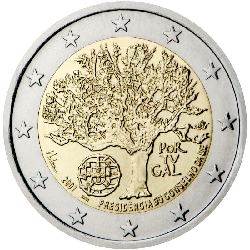Opis: Środkowa część monety przedstawia dąb korkowy (Quercus suber). Pod koroną dębu z lewej strony pnia widnieje herb Portugalii, a z prawej – słowo „PORTUGAL” zapisane sylabami w trzech linijkach. Wzdłuż dolnej krawędzi środkowej części monety biegną półkoliście: podpis artystki (I. Vilar), rok emisji (2007), znak mennicy (INCM) oraz legenda „PRESIDÊNCIA DO CONSELHO DA UE” (przewodnictwo w Radzie UE). W otoku przedstawiono 12 gwiazd Unii Europejskiej.