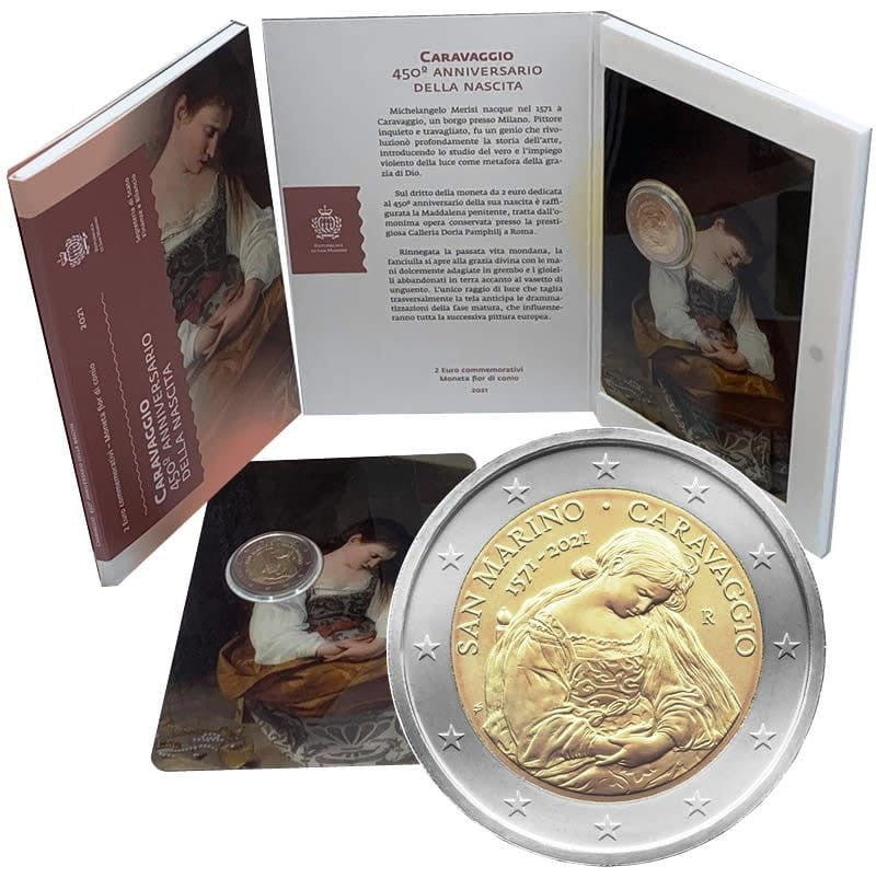 Opis: Głównym motywem monety jest pokutująca Maria Magdalena z dzieła Caravaggia o tym samym tytule, które znajduje się w Galerii Doria Pamphilj w Rzymie. W lewej górnej części widać napis „SAN MARINO”, zaś poniżej – lata „1571−2021”. Po lewej stronie umieszczono inicjały autorki Silvii Petrassi „SP”, a w prawej górnej części – napis „CARAVAGGIO” i znak mennicy. W otoku monety widnieje 12 gwiazd z flagi Unii Europejskiej.