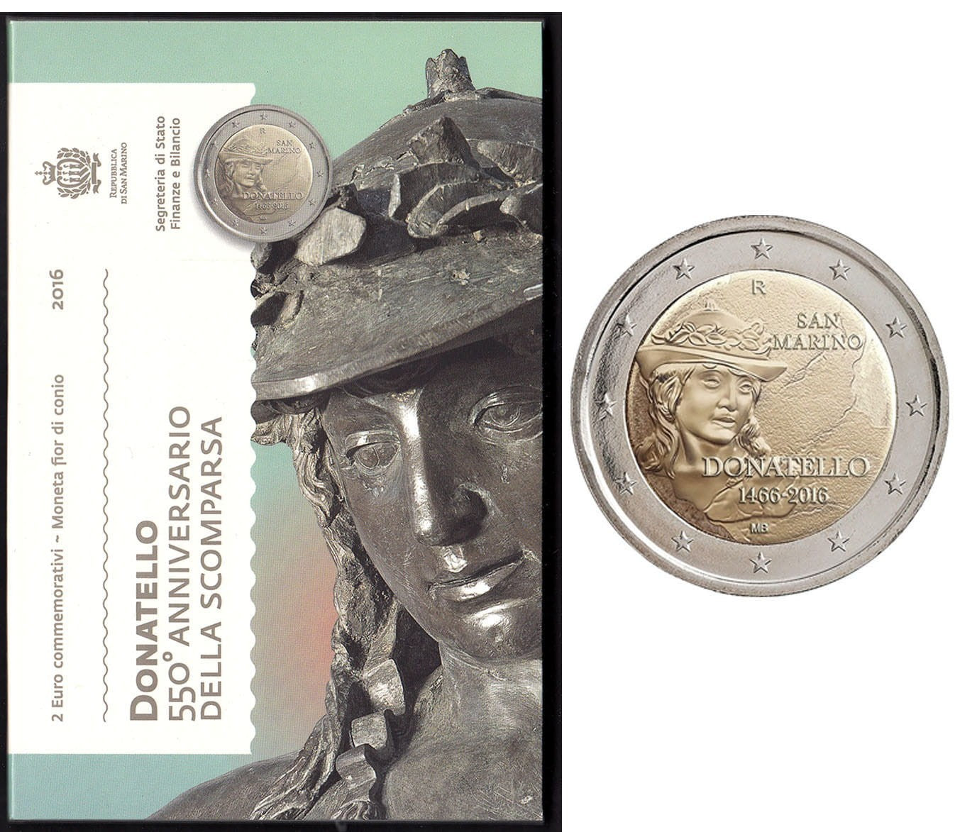 Opis: Na pierwszym planie z lewej strony widnieje głowa Dawida – fragment rzeźby z brązu dłuta Donatella. Powyżej znajdują się: pośrodku znak mennicy „R”, a po prawej nazwa kraju emisji „SAN MARINO”. W dolnej części monety widnieją: po prawej napis „Donatello” oraz daty „1466–2016”, a centralnie przy otoku monogram grawera „MB”. W otoku monety widnieje 12 gwiazd Unii Europejskiej.