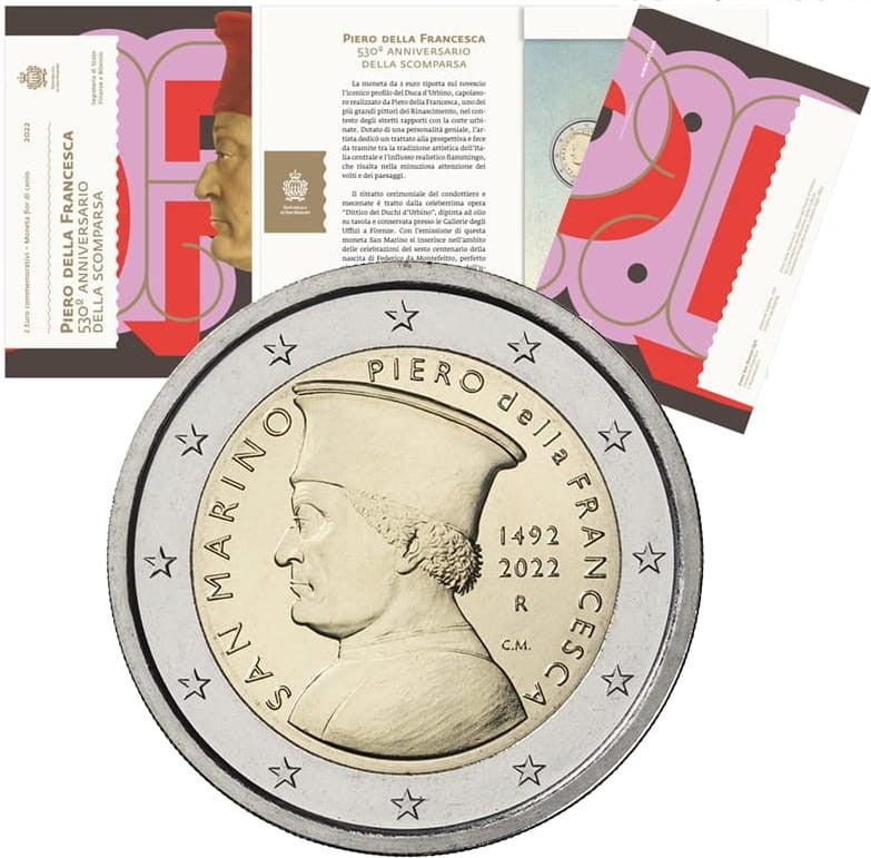 Opis: W centrum monety znajduje się profil Federica da Montefeltro, który jest fragmentem obrazu „Portrety Montefeltrów” pędzla Piera della Francesca z Galerii Uffizi we Florencji. Przy otoku z lewej strony biegnie napis „SAN MARINO”, a z prawej strony – napis „PIERO della FRANCESCA”. W prawej części umieszczono także lata „1492” i „2022”, oznaczenie mennicy rzymskiej „R” oraz inicjały autorki Claudii Momoni „C.M.”. W otoku monety widnieje 12 gwiazd z flagi Unii Europejskiej.