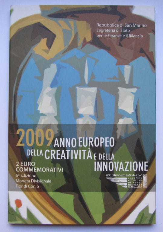 Opis: Wewnętrzna strona monety przedstawia przedmioty symbolizujące badania naukowe: książkę, cyrkiel, probówkę, kolbę. Po lewej stronie umieszczono trzy pióra stanowiące symbol Republiki San Marino, a po prawej rok wybicia monety „2009” i znak mennicy „R”. Na górze umieszczono napis „CREATIVITÁ INNOVAZIONE”. Pod spodem natomiast oznaczenie państwa emitującego „SAN MARINO” i inicjały artysty „A.M.”.