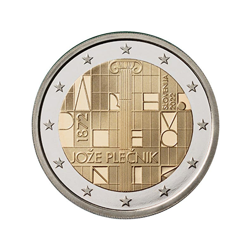 Opis: Moneta przedstawia detal wielkiego okna znajdującego się w czytelni Biblioteki Narodowej i Uniwersyteckiej z filarem na pierwszym planie. Na tle okna umieszczono kompozycję składającą się z liter „A R H. P L E Č N I K”. Te litery są wpisane w okno dokładnie w tej kolejności i mogą być odczytywane metaforycznie jako podpis architekta faktycznie widniejący na jego dziele. Litery są umieszczone w głębi otworów okiennych i można je rozumieć (w języku architekta Plečnika) jako przestrzenne ingerencje architektoniczne, jako wyróżnienia umieszczone w elewacji lub jako obiekty zaprojektowane w sposób geometryczny. Cała kompozycja przedstawia ideę przestrzeni, która oddaje bogactwo pomysłów architekta. Centralnym elementem jest główny filar, którego rolą jest wyznaczenie przestrzeni przedstawionej na monecie przez ustalenie proporcji między częścią zewnętrzną/wewnętrzną lub przednią/tylną, co jest jedną z charakterystycznych cech projektowania przestrzeni u Plečnika. W efekcie kompozycja staje się przestrzenną miniaturą, przestrzenią w przestrzeni, jest wielowarstwowa i mistyczna. Na dole znajduje się napis „JOŽE PLEČNIK”. Po lewej stronie umieszczono w pionie rok „1872”, po prawej stronie w pionie – kraj emisji „SLOVENIJA”, a poniżej – rok emisji „2022”. W otoku monety widnieje 12 gwiazd z flagi Unii Europejskiej.