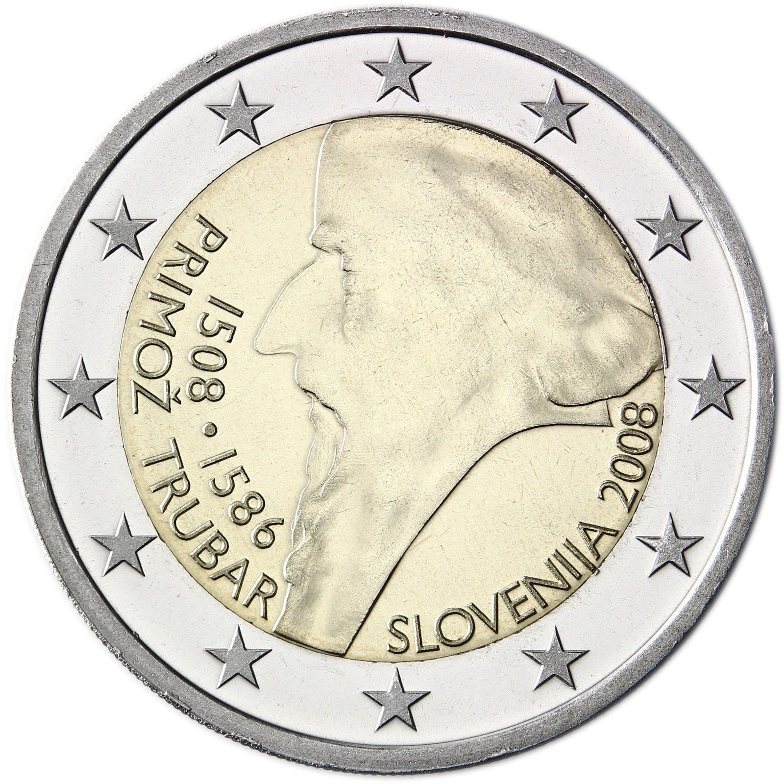 Opis: Moneta przedstawia profil Primoža Trubara. Po lewej stronie widnieją napisy „PRIMOŽ TRUBAR” oraz „1508 • 1586”, a na dole po prawej stronie – „SLOVENIJA 2008”. W otoku przedstawiono 12 gwiazd Unii Europejskiej.