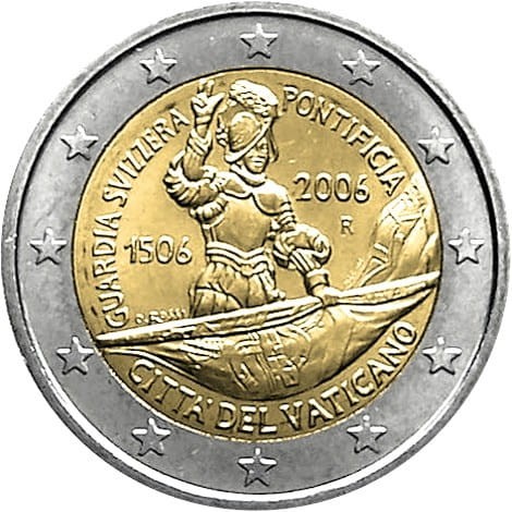 Opis: Moneta przedstawia żołnierza Gwardii Szwajcarskiej składającego przysięgę na wierność papieżowi. Wokół postaci biegnie półokrągły napis „GUARDIA SVIZZERA PONTIFICIA”, a pod flagą znajduje się nazwa państwa emitującego monetę „CITTÀ DEL VATICANO”. Po lewej stronie widnieje rok „1506”, a pod nim, wzdłuż drzewca flagi – podpis grawera „O. ROSSI”. Po prawej stronie, ponad znakiem mennicy „R”, znajduje się rok wybicia monety „2006”. W otoku monety widnieje 12 gwiazd Unii Europejskiej.