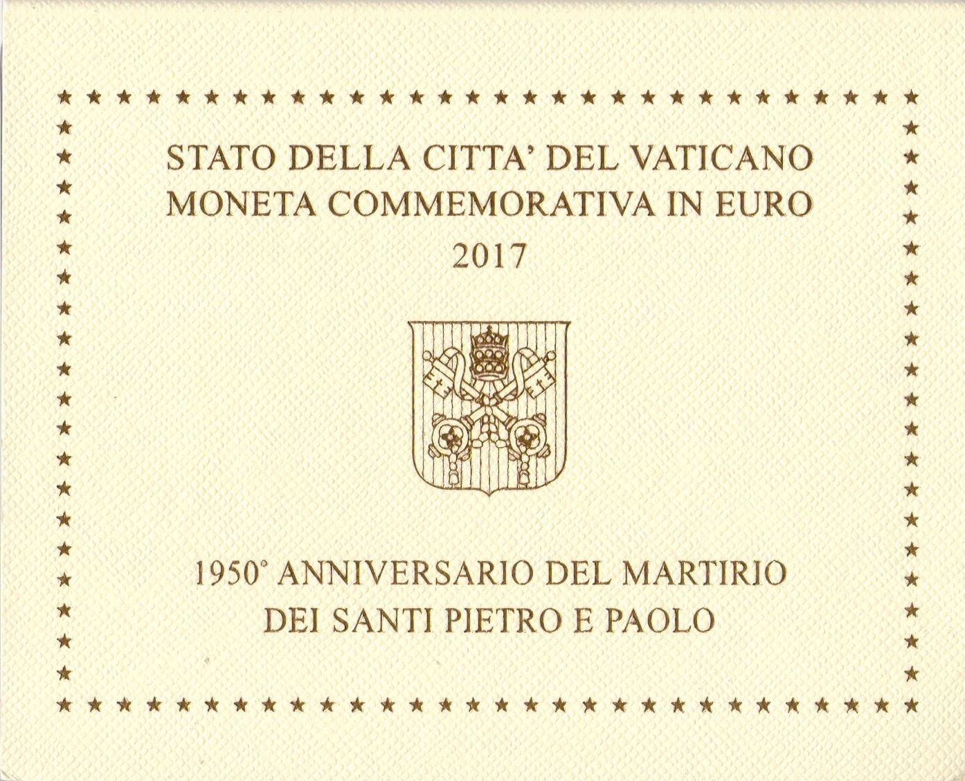 Opis: Moneta przedstawia świętych Piotra i Pawła oraz ich atrybuty: klucze i miecz. Górą biegnie półkoliście napis „CITTÀ DEL VATICANO” (Państwo Watykańskie), a dołem – „1950o DEL MARTIRIO DEI SANTI PIETRO E PAOLO” (1950. rocznica męczeństwa świętych Piotra i Pawła). Na dole po lewej stronie widnieje rok emisji „2017”, a po prawej – znak mennicy „R”. Między nimi umieszczono nazwisko projektantki „G. TITOTTO”. W otoku monety widnieje 12 gwiazd Unii Europejskiej.