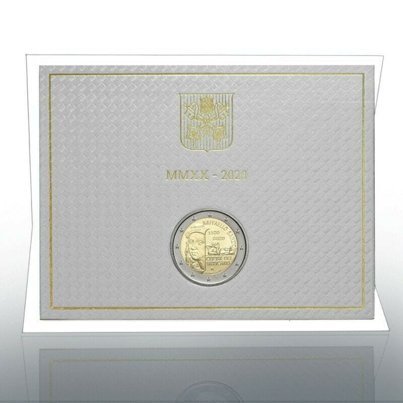 Opis: Centralny motyw monety to portret Rafaela i dwa anioły. Po prawej stronie biegnie półkoliście napis „RAFFAELLO SANZIO”. Nad obrazem aniołów widnieją lata „1520” i „2020”, a pod nim – nazwa kraju emisji „CITTÀ DEL VATICANO” (Państwo Watykańskie). Na samym dole umieszczono znak mennicy „R” oraz sygnaturę projektantki „D. LONGO”. W otoku monety widnieje 12 gwiazd z flagi Unii Europejskiej.