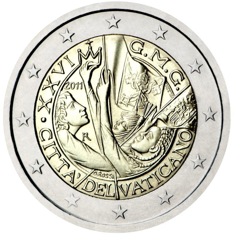 Opis: Wewnętrzna część monety przedstawia grupę młodych ludzi z flagami, znak mennicy „R” i oznaczenie roku „2011”. Wzdłuż otoku biegną na górze cyfry rzymskie „XXVI” i litery „G.M.G.”, skrót od Giornata Mondiale della Gioventù (Światowy Dzień Młodzieży), a na dole nazwa kraju emisji „CITTÀ DEL VATICANO” (Państwo Watykańskie). W otoku monety widnieje 12 gwiazd Unii Europejskiej.