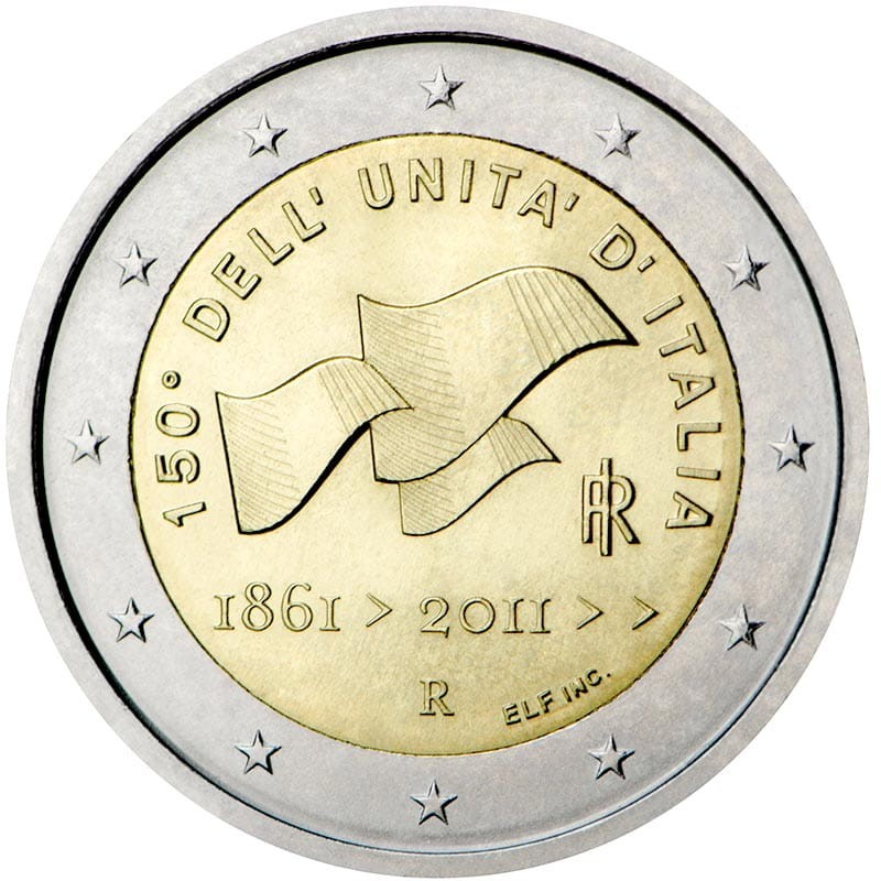 Opis: W środkowej części monety przedstawiono centralnie logo 150. rocznicy zjednoczenia Włoch: trzy trzepoczące flagi, które upamiętniają trzy wcześniejsze pięćdziesięciolecia – 1911, 1961 i 2011 – jako symbol doskonałej więzi pomiędzy pokoleniami. Flagi okala biegnący po półokręgu wzdłuż otoku napis „150° DELL’UNITÀ D’ITALIA” (150. rocznica zjednoczenia Włoch), a z prawej strony znajduje się oznaczenie kraju-emitenta: zachodzące na siebie litery „RI”. Poniżej flag widnieją dwie daty „1861 › 2011 › ›”. Pod nimi umieszczono centralnie znak mennicy „R”, a przy otoku po prawej stronie inicjały artysty rytownika, Ettore Lorenza Frapicciniego, wraz z trzema pierwszymi literami jego zawodu (incisore) – „ELF INC”. W otoku przedstawiono 12 gwiazd Unii Europejskiej.