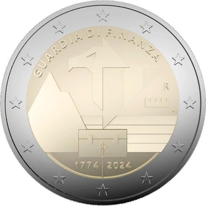Opis: W środkowej części monety przedstawiono stylizowaną wersję symbolu heraldycznego Guardia di Finanza. Obrazuje on ideę bezpieczeństwa i ukazuje wizję przyszłej roli korpusu, który choć pamięta o przeszłości, jest gotowy na nadchodzące lata i nowe wyzwania. W tym symbolu znajdują się różne elementy: góra, morze i niebo, czyli środowisko naturalne, w którym działa Guardia di Finanza, a także gryf, mityczne zwierzę, które według legendy strzeże skarbu państwa, przedstawionego jako skrzynia i korona z wieżyczkami. Na górze biegnie półkoliście napis „GUARDIA DI FINANZA”. Na dole umieszczono litery „RI”, monogram Republiki Włoskiej, oraz rok powstania Guardia di Finanza i rok emisji monety „1774–2024”. Po prawej stronie widać znak mennicy rzymskiej „R” i inicjały projektantki Marty Bonifacio „MB”. W otoku monety widnieje 12 gwiazd z flagi Unii Europejskiej.