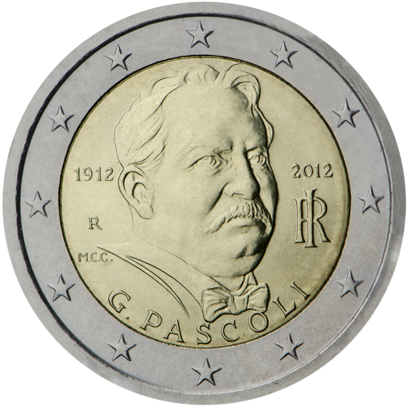 Opis: W wewnętrznej części monety jest ukazany portret Giovanniego Pascolego, poety z regionu Romania, wybitnego przedstawiciela literatury włoskiej końca XIX wieku. Obok portretu po lewej stronie wybito rok śmierci poety „1912”, znak mennicy „R” i inicjały projektantki monety Marii Carmeli Colaneri „M.C.C.”, a po prawej – rok emisji „2012” nad monogramem Republiki Włoskiej „RI”. Pod portretem wzdłuż dolnego brzegu części wewnętrznej biegnie po łuku napis „G. PASCOLI”. W otoku monety widnieje 12 gwiazd Unii Europejskiej.
