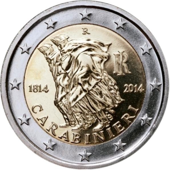 Opis: Centralny element wzoru stanowi wariację na temat rzeźby Antonia Bertiego z 1973 roku przedstawiającej patrol karabinierów podczas burzy. Po prawej stronie znajdują się nachodzące na siebie litery „RI” (monogram Republiki Włoskiej) i oznaczenie roku „2014”, po lewej – rok „1814”, powyżej – litera „R” (znak mennicy rzymskiej), a w dolnym polu – monogram projektantki Luciany De Simoni „LDS” oraz napis „CARABINIERI” (Karabinierzy). W otoku monety widnieje 12 gwiazd Unii Europejskiej.