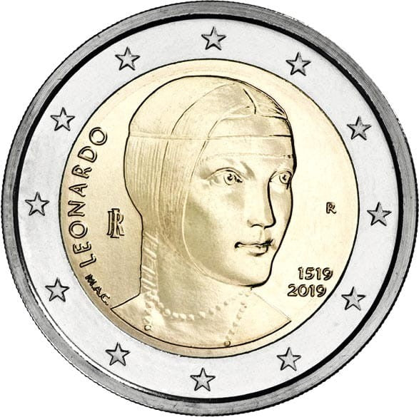 Opis: Moneta przedstawia fragment obrazu Leonarda da Vinci „Dama z gronostajem” (w zbiorach Muzeum Narodowego w Krakowie). Po lewej stronie znajdują się: przy otoku napis „LEONARDO” oraz inicjały projektantki monety Marii Angeli Cassol „MAC” i monogram Republiki Włoskiej „RI”. Z prawej strony umieszczono znak mennicy rzymskiej „R” oraz daty „1519–2019” – rok śmierci Leonarda i rok emisji monety. W otoku monety widnieje 12 gwiazd Unii Europejskiej.
