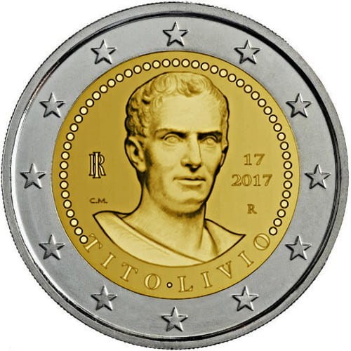 Opis: Moneta przedstawia popiersie rzymskiego historyka Tytusa Liwiusza wzorowane na rzeźbie Lorenza Larese Morettiego. Po lewej stronie widnieje oznaczenie Republiki Włoskiej „RI” i monogram projektantki Claudii Momoni „C.M.”, po prawej – rok śmierci Liwiusza „17” i rok emisji „2017” oraz znak mennicy rzymskiej „R”. Przy otoku biegnie okrąg z kropek, w który wpisane są słowa „TITO • LIVIO”. W otoku monety widnieje 12 gwiazd Unii Europejskiej.
