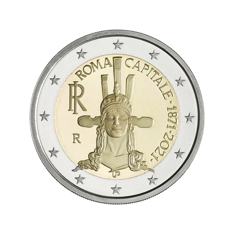 Opis: Motyw przedstawia fragment rzeźby Dea Roma autorstwa Angela Zanellego, umieszczonej w centrum Altare della Patria – wielkiego ołtarza wotywnego dedykowanego narodowi włoskiemu, wchodzącego w skład znajdującego się w Rzymie kompleksu Vittoriano. Powyżej widnieje napis: „ROMA CAPITALE”; po prawej stronie – daty „•1871•2021•”, odpowiednio: rok ogłoszenia Rzymu stolicą Włoch oraz rok emisji monety; po lewej stronie – litery „RI”, akronim od „Republiki Włoskiej”, oraz litera „R”, oznaczająca mennicę rzymską; w egzerdze – litery „UP”, inicjały projektantki Uliany Pernazzy. W otoku monety widnieje 12 gwiazd z flagi Unii Europejskiej.