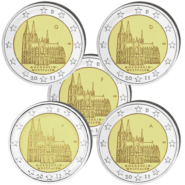 Opis: W środkowej części monety nad napisem „Nordrhein-Westfalen” ukazano katedrę w Kolonii, jako symbol niemieckiego kraju związkowego Nadrenia Północna-Westfalia. Wokół otoku rozmieszczono 12 gwiazd Unii Europejskiej, a na dole – rok emisji „2011”.