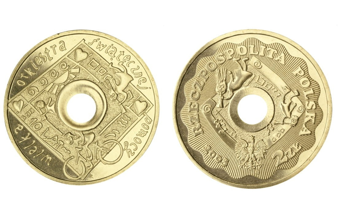 Rewers: W centralnej części okrągły otwór. Wokół stylizowane rysunki dziecięce przedstawiające dzieci, figur geometryczne, serca. Z lewej strony ukośnie napis: 10 LAT. Wokół napis: wielka orkiestra świątecznej pomocy.