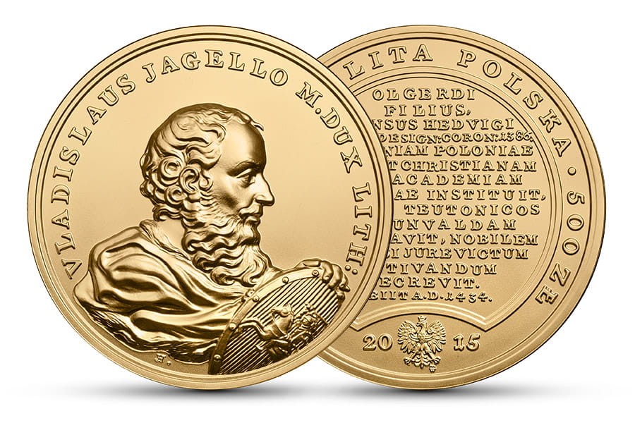 AWERS: W centralnej części monety – łaciński napis, będący krótką biografią władcy: OLGERDI/FILIUS,/SPONSUS HEDWIGIS/A•D•1385•DESIGN:CORON:1386/LITHUANIAM POLONIAE/UNIVIT, ET CHRISTIANAM / FECIT,ACADEMIAM/CRACOVIAE INSTITUIT,/EQUITES TEUTONICOS/AD GRUNVALDAM/PROSTRAVIT,NOBILEM/NON NISI JURE VICTUM/CAPTIVANDUM/DECREVIT./OBIIT A.D. 1434. Na dole – wizerunek orła ustalony dla godła Rzeczypospolitej Polskiej, rozdzielający na dwie części rok emisji: 20-15. W otoku – napisy oddzielone dekoracyjną perełką: RZECZPOSPOLITA POLSKA, 500 ZŁ (nominał).