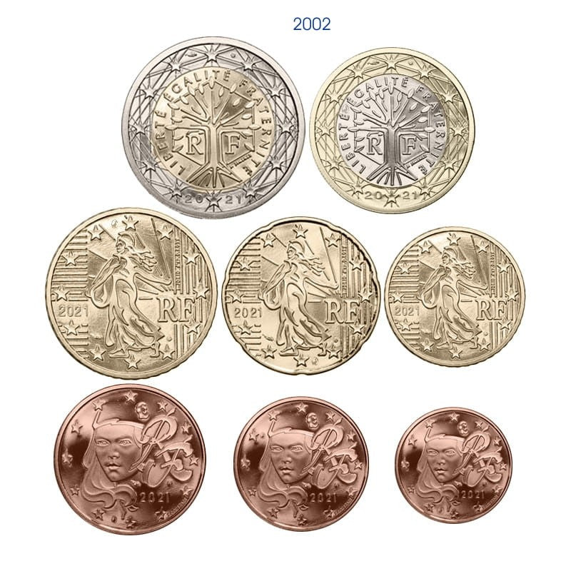 Monety 10, 20 i 50 centów: motyw siejącej kobiety jest stałym elementem historii francuskiego franka. Zaprojektowany przez Laurenta Jorlo, „ten nowoczesny, ponadczasowy motyw graficzny symbolizuje Francję, która integrując się z Europą pozostaje wierna swojej tożsamości”.