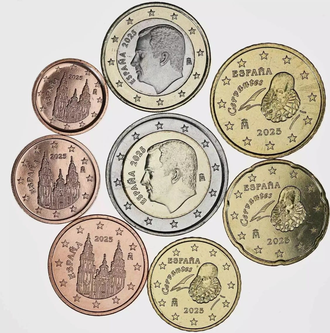 Monety 1, 2 i 5 centów: przedstawiają katedrę w Santiago de Compostela – klejnot hiszpańskiej architektury romańskiej i cel pielgrzymek z całego świata. Na monetach pokazana jest monumentalna fasada zwrócona w stronę placu Obradoiro, stanowiąca wspaniały przykład hiszpańskiego baroku. Jej budowę rozpoczęli w 1667 r. architekci Jose del Toro i Domingo de Andrade. Budowę dokończył w XVIII w. Fernando Casas y Novoa.