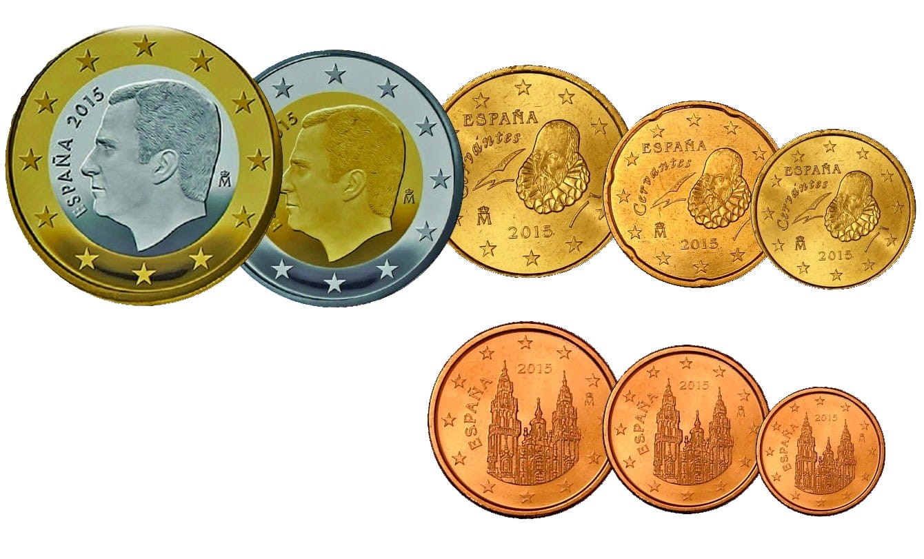 Monety 1 € i 2 €: na monetach figuruje portret obecnego króla Filipa VI Burbona. Napis na brzegu monety 2 €: 2**, sześciokrotnie powtórzone, skierowane na przemian w stronę awersu i rewersu.