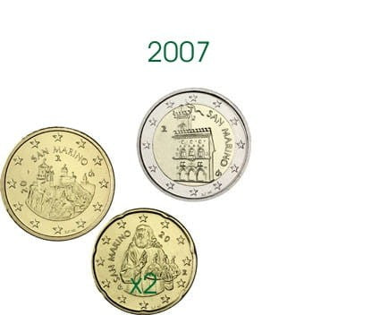 Na monecie 2 € ukazana jest siedziba rządu (Palazzo Pubblico). Napis na brzegu monety 2 €: 2*, sześciokrotnie powtórzone, skierowane na przemian w stronę awersu i rewersu.
