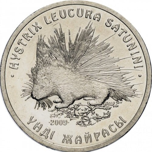 Porcupine (Hystrix Leucura Satunini) Date of issue: 28 October, 2009. Diameter – 31 mm, weight – 11,37 gram Images and inscriptions of observe and back sides of coins are relief. The lateral surface (drove) is grooved with 10 sectors of corrugation. On
