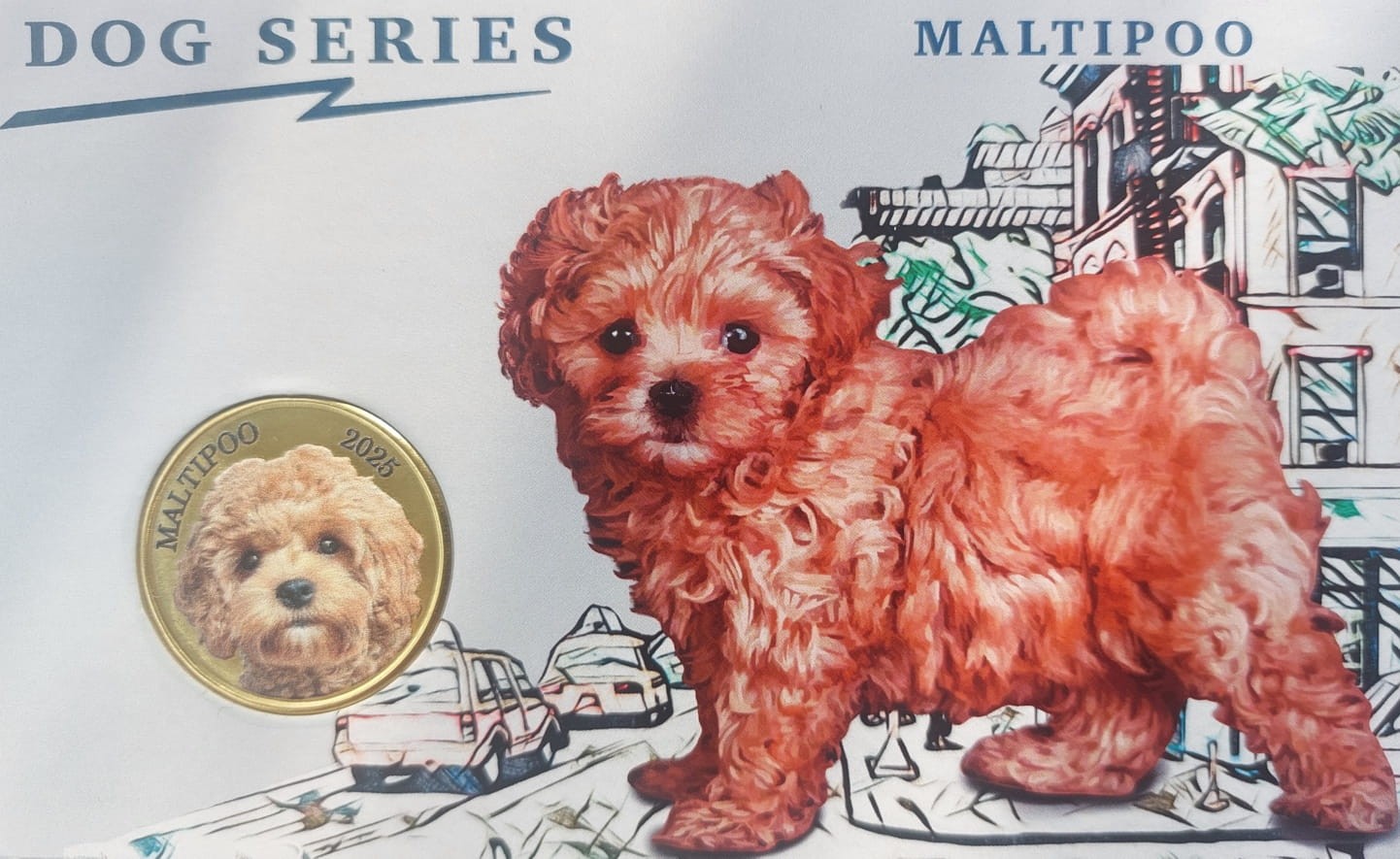 Rewers monety: Ukazuje kolorowy wizerunek psa rasy Maltipoo, hybrydy powstałej z połączenia maltańczyka i pudla miniaturowego, cenionej za przyjazne usposobienie i hipoalergiczne futro.