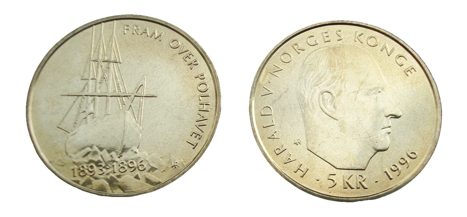 w centrum monety statek polarny Fram na lodach Arktyki; poniżej daty: 1893-1896; w prawym otoku: FRAM OVER POLHAVET (Fram przez Ocean Arktyczny)