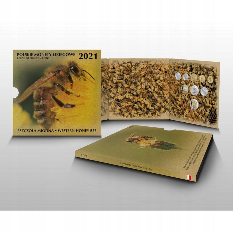 Monety obiegowe z 2021 roku (od 1 grosza do 5 złotych) umieszczone w ekskluzywnym blistrze.