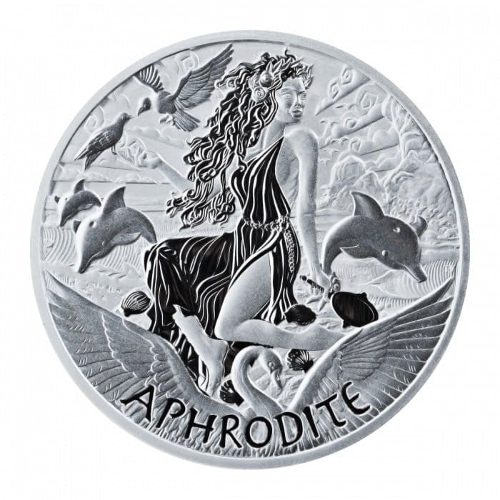 Rewers przedstawia wizerunek Afrodyty siedzącej na plaży przy skale, otoczoną muszlami przegrzebków, trzymającą w lewej ręce lustro, a w prawej gołębia. Towarzyszy jej łabędź i trzy delfiny, a w tle widać ocean i chmury. Projekt zawiera również napis APHRODITE oraz znak mennicy "P" The Perth Mint.