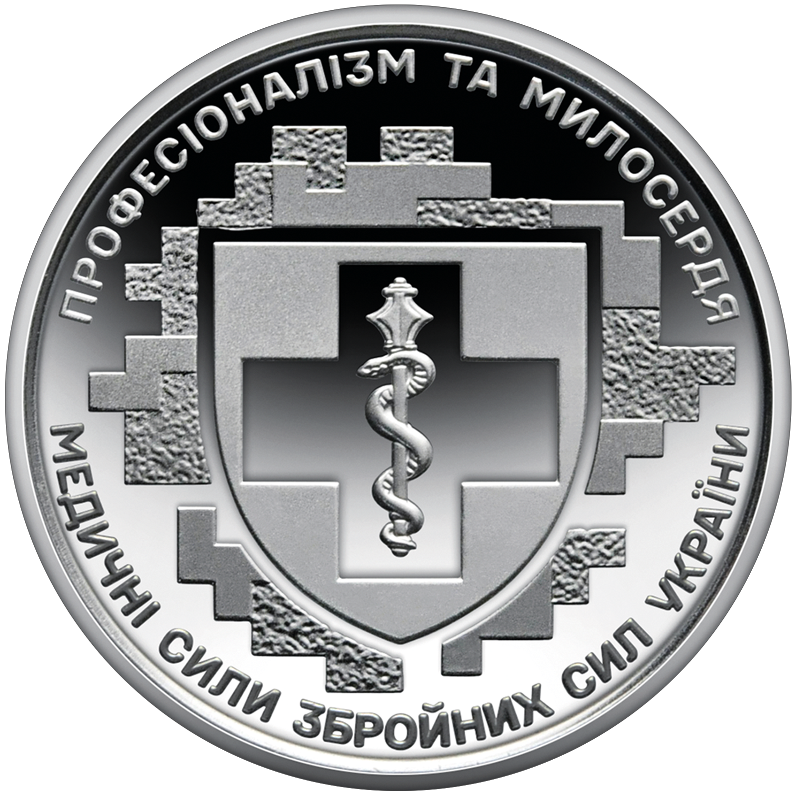Wokół emblematu widnieją napisy: „ПРОФЕСІОНАЛІЗМ ТА МИЛОСЕРДЯ” (Profesjonalizm i miłosierdzie) oraz „МЕДИЧНІ СИЛИ ЗБРОЙНИХ СИЛ УКРАЇНИ” (Medyczne Siły Zbrojne Ukrainy).