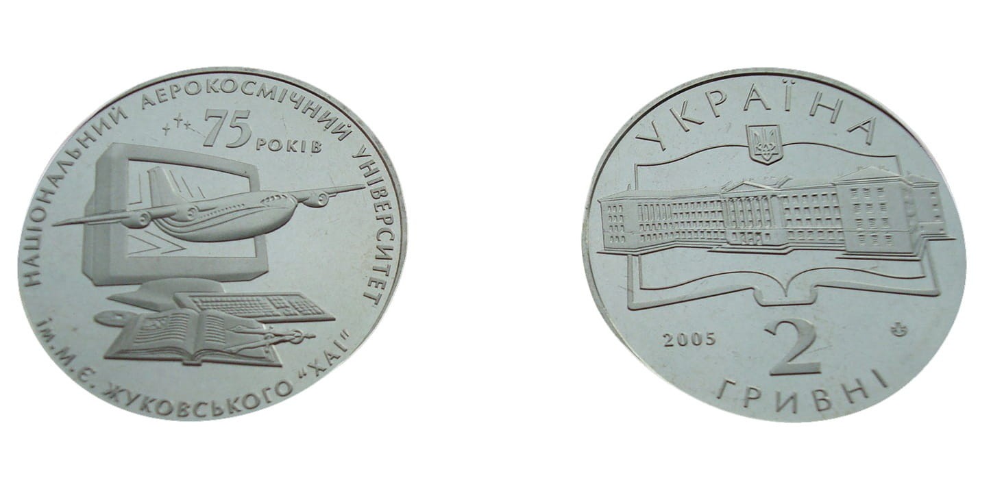 Opis: Moneta poświęcona 75. rocznicy powstania Aerokosmicznego Narodowego Uniwersytetu im. M. Żukowskiego w Charkowie. Jego rozwój jest bezpośrednio powiązany z rozwojem przemysłu lotniczego i nauki. Jest to jedyna wyższa uczelnia, na której według własnej konstrukcji i pomysłu opracowywano samoloty pod kierownictwem profesora Neumanna. Seryjnie były produkowane w zakładach lotniczych i były eksploatowane w ruchu pasażerskim.