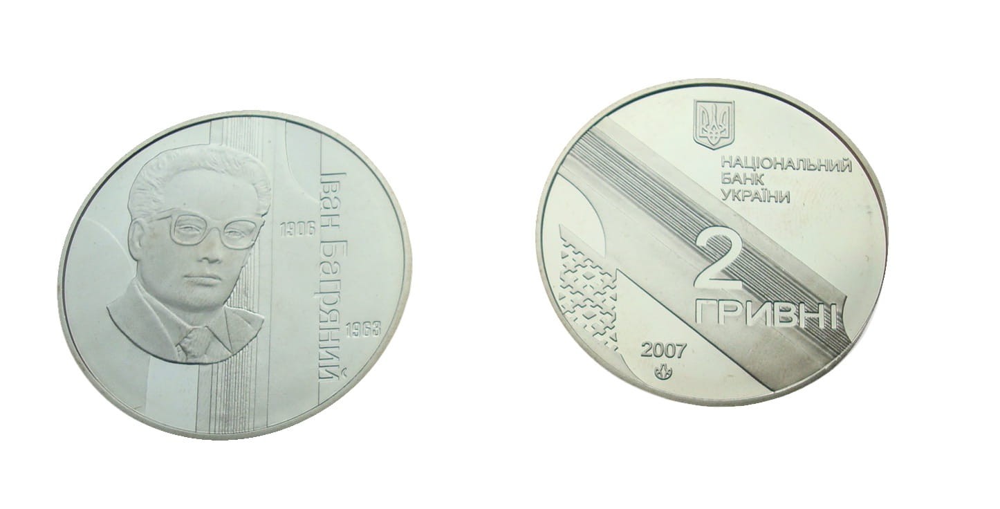 Opis: Moneta poświęcona publicyście, pisarzowi, poecie, działaczowi politycznemu - Iwanowi P. Bahrianemu. Autor powieści, sztuk, wierszy, tworów publicystycznych. Po represjach i odbycia kary pozbawienia wolności wyemigrował do Niemiec, gdzie stworzył Ukraiński Ruch Artystyczny (MUR) i założył Rewolucyjną Partię Demokratyczną Ukrainy.