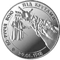 Rewers: Kompozycja składająca się z dwóch części, które obrazują historyczny moment przeciwstawienia się dwóch sił. Pierwsza część - statyczna - przedstawia obrońców niezależności UNR. Po prawej dynamiczna alegoria bolszewickiej interwencji przedstawiona poprzez rozpostartą rękę, która wskazuje kierunek ataku konnicy. Dookoła monety napis: "80-РІЧЧЯ БОЮ ПІД КРУТАМИ. 29.01.1918".