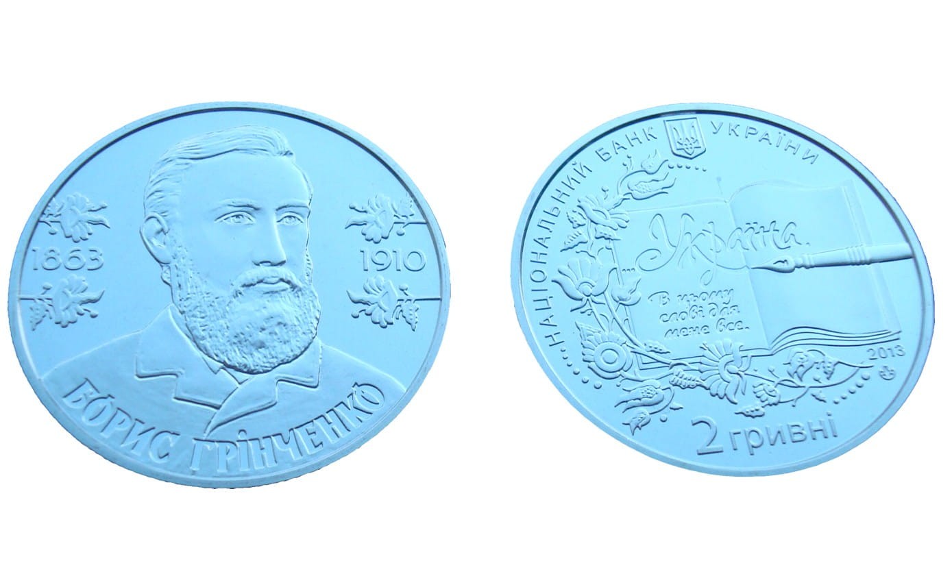 Awers: Na górze od lewej strony wzdłuż rantu napis Narodowy Bank Ukrainy przedzielony godłem państwowym. Na dole nominał ДВІ ГРИВНІ oraz rok po prawej stronie rok wydania 2013 i logo mennicy NBU. Po środku kompozycja przedstawiająca pióro oraz księgę ozdobioną kwiatowym ornamentem. Na jej stronach umieszczono zdanie B. Grinczenki: …УКРАЇНА. В ЦЬОМУ СЛОВІ ДЛЯ МЕНЕ ВСЕ. (...Ukraina. W tym słowie dla mnie wszystko).
