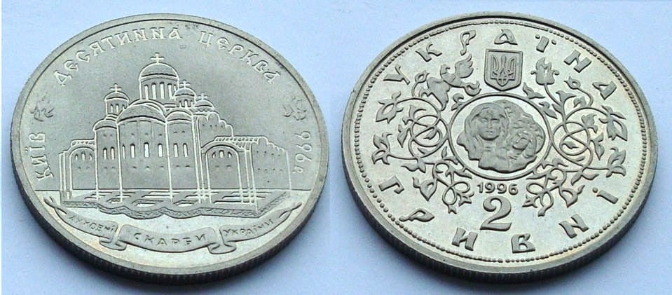 Opis: Moneta wydana z okazji 1000-lecia budowy na Górze Zamkowej przez Włodzimierza Wielkiego Cerkwi Dzisięcinnej w Kijowie - pierwszej kamiennej świątyni Rusi Kijowskiej. Do dziś zachowały się jedynie fragmenty fundamentów.