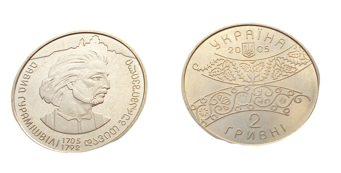 Awers: Połączenie dwóch narodowych ornamentów: gruzińskiego i ukraińskiego, symbolizujące związek i przyjaźń pomiędzy tymi narodami. Na górze półkolem napis УКРАЇНА. pod nim rok wydania 2005 przedzielony w połowie małym państwowym herbem Ukrainy. Na dole półkolem napis 2 ГРИВНІ. Znak mennicy NBU.