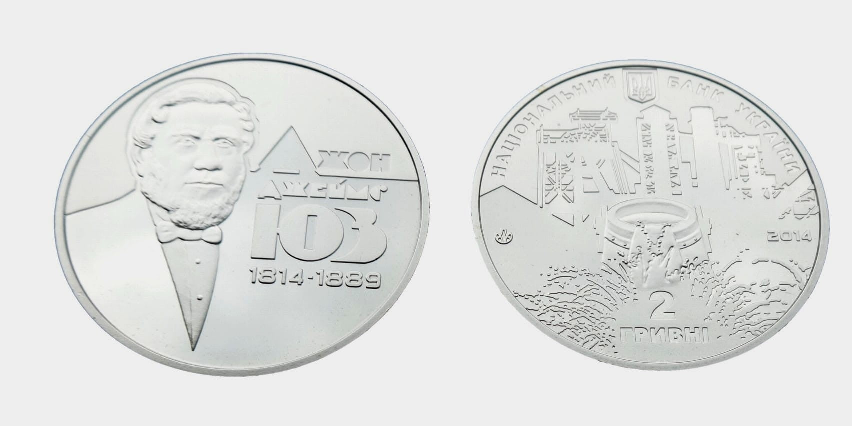 Opis: Moneta poświęcona brytyjskiemu inżynierowi górnictwa, metalurgowi, przemysłowcu, założycielowi fabryki metalurgicznej we wsi Jozówka, wokół której powstał później Donieck - J.J. Hughesowi.