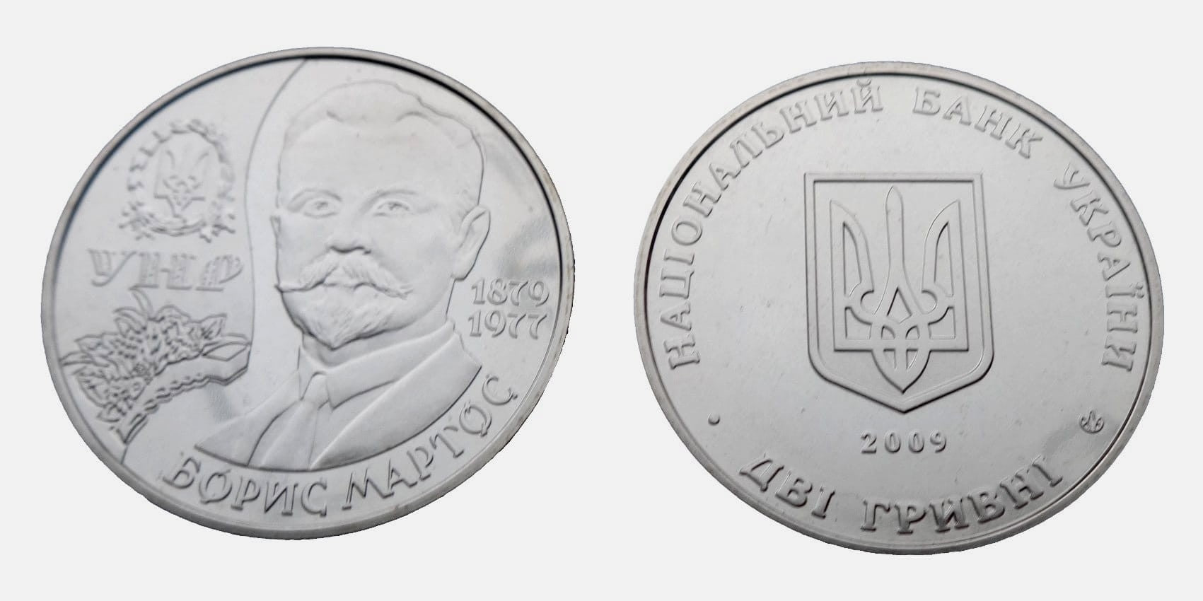 Opis: Moneta poświęcona ekonomiście, pedagogowi, państwowemu i społecznemu działaczowi - Borysowi M. Martosowi. Od 1917 członek Rady Centralnej, od 1918 r. przewodniczący Wszechukraińskiego Komitetu Spółdzielczego. Od 1919 minister finansów i premier rządu Ukraińskiej Republiki Ludowej.