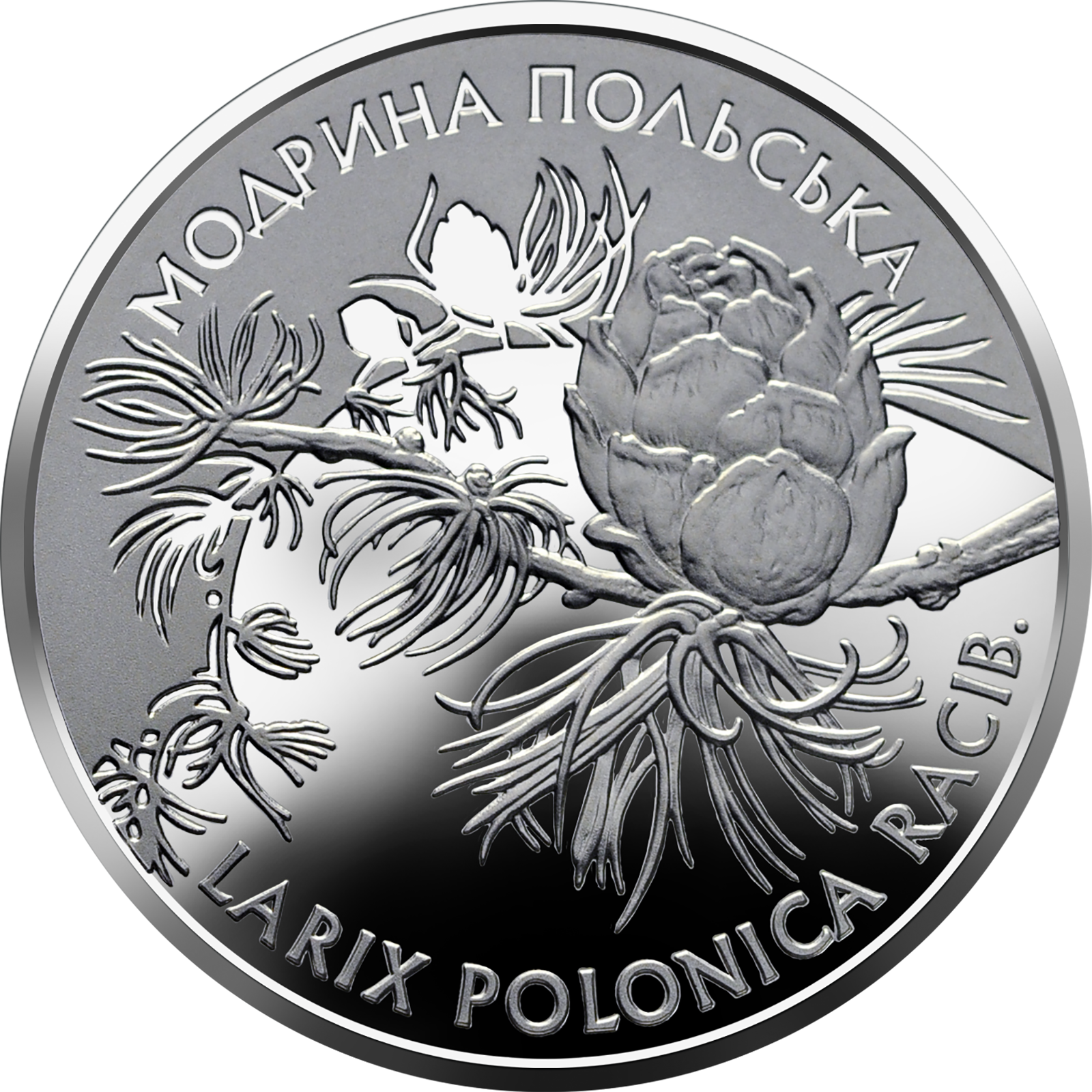 Opis: Moneta poświęcona zanikającemu gatunkowi drzew iglastych - modrzewiowi polskiemu, występującemu w ukraińskich Karpatach. Gatunek zapisany do Czerwonej Księgi Ukrainy. Hodowany w lasach, sadach i ogrodach botanicznych.