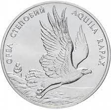 Opis: Moneta poświęcona rzadkiemu i cennemu ukraińskiemu gatunkowi z rodziny jastrzębiowatych - orłu stepowemu, którego największa ilość utrzymuje się i rozmnaża w zoo "Askania Nowa". W 1980 roku gatunek został wpisany do Czerwonej Księgi Ukrainy.