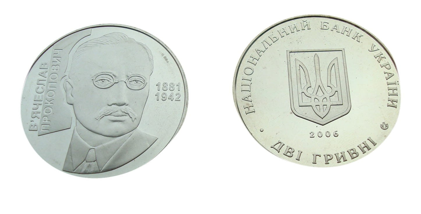 Rewers: portret W. Prokopowycza, na lewo od niego w pionie napis В’ЯЧЕСЛАВ ПРОКОПОВИЧ, a po prawej lata życia 1881 / 1942.