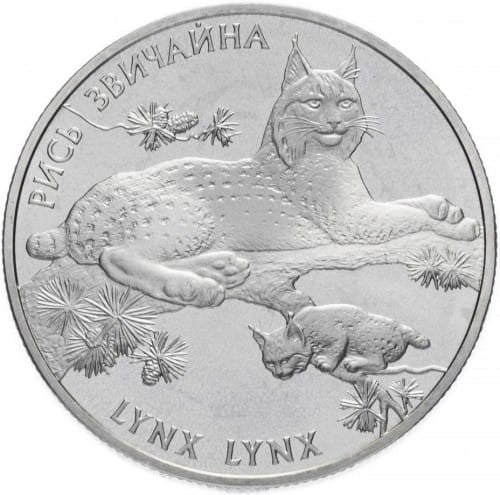 Opis: Moneta poświęcona rysiowi eurazjatyckiemu z rzędu drapieżnych. Cenny futrzany zwierz występuje przede wszystkim w ukraińskich Karpatach, maleńka część populacji występuje w trudno dostępnych częściach lasów na Wołyniu. Gatunek zapisany do Czerwonek Księgi Ukrainy.