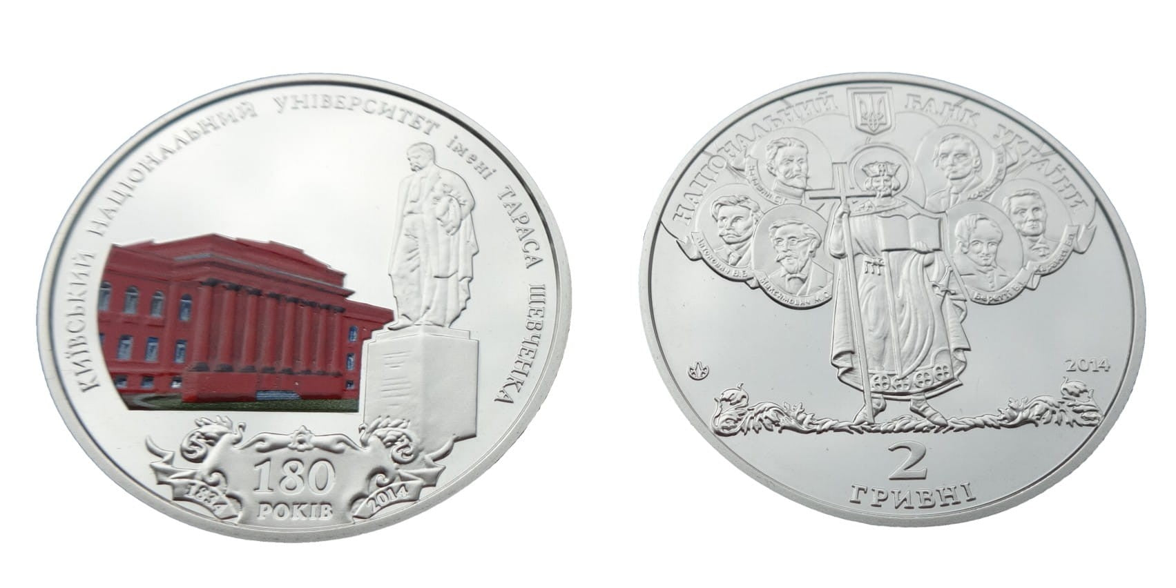 Awers: Na górze wzdłuż rantu napis Narodowy Bank Ukrainy przedzielony godłem państwowym. Na dole w dwóch rzędach nominał ДВІ ГРИВНІ. Po prawej rok wydania 2014, po lewej logo mennicy NBU. Po środku kompozycja przedstawiająca na tle postaci Świętego Włodzimierza portrety wybitnych osobistości związanych z Uniwersytetem Kijowskim.