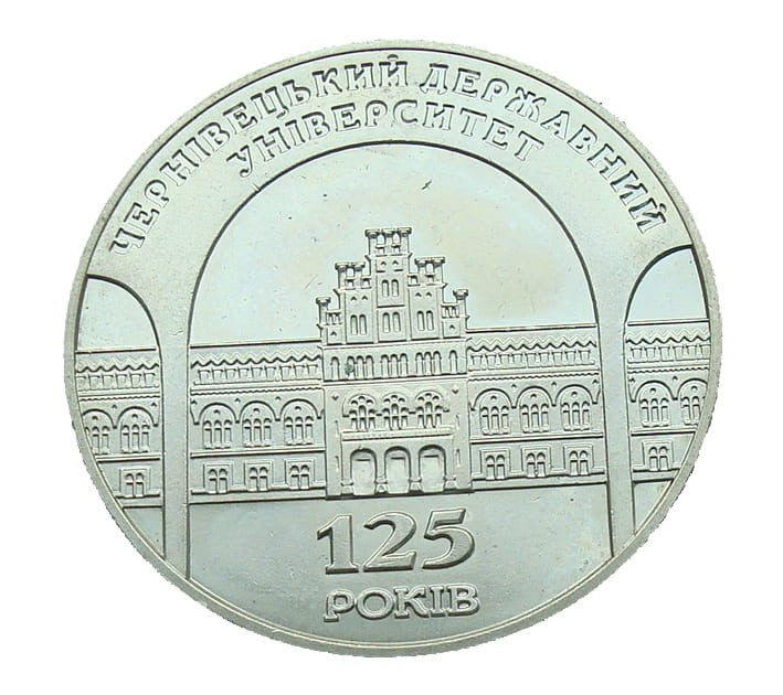 Rewers: między łukami główna fasada budynku według projektu architekta J. Hławki. Napisy: ЧЕРНІВЕЦЬКИЙ ДЕРЖАВНИЙ УНІВЕРСИТЕТ, 125 років.