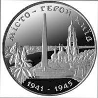 monety na tle Dniepru i lewobrzeżnej części miasta główny fragment kompleksu "Park Wiecznej Sławy" - obelisk Niewidomego Żołnierza i przylegająca do niego aleja Poległych Bohaterów z mogiłami obrońców i wyzwolicieli Kijowa. Po prawej stronie obelisku Sławy wizerunek soboru Spasa na Berestowi, wielkiej dzwonnicy Ławry Kijowsko - Peczerskiej, drzew i dekoracyjnych krzewów. Po lewej stronie gałązka kasztanowca z trzema kwiatami. Wokół monety na planie koła napisy ""