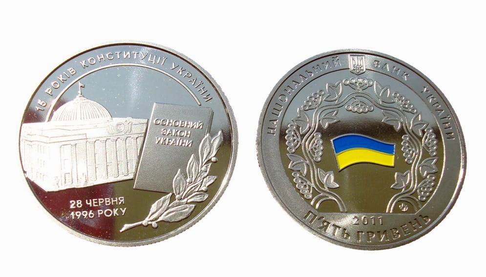 Opis: Moneta poświęcona 15. rocznicy przyjęcia przez Radę Najwyższą Ukrainy Konstytucji Ukrainy,