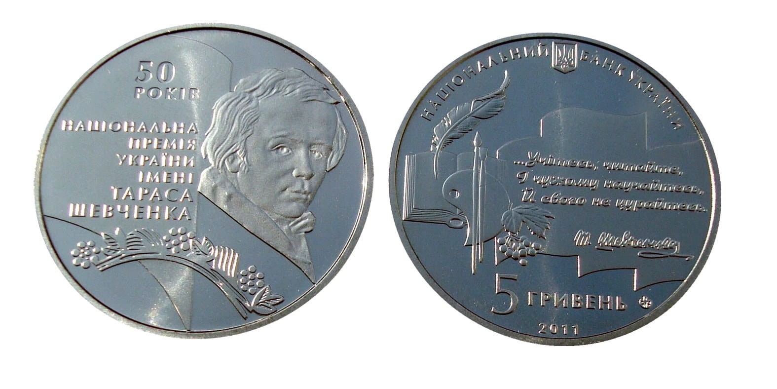 UKRAINA 5 UAH 50 lat ustanowienia nagrody im. Tarasa Szewczenki 2011