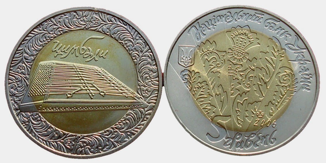 Opis: Moneta poświęcona strunowemu uderzanemu instrumentowi muzycznemu, od dawna znanemu na Ukrainie - cymbałom. Składają się one z drewnianego korpusu trapezoidalnej formy i metalowych strun, w które uderza się pałeczkami lub młoteczkami.